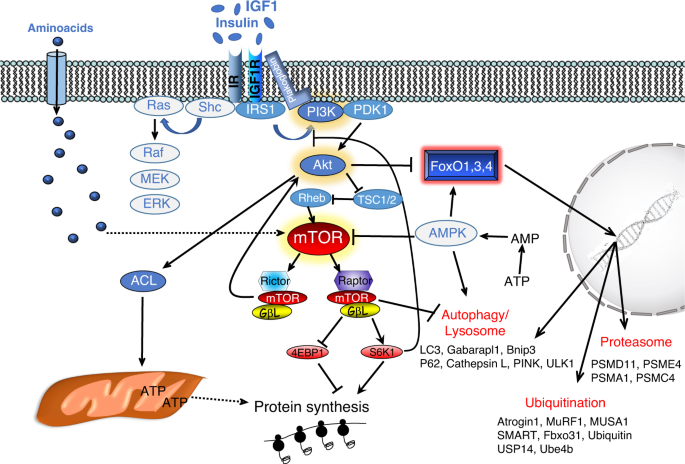Second, despite the fact that most of the pathways regulating muscle mass, such as Insulin/IGF1 or TGFβ/Activin/BMP, impinge both on protein synthesis and degradation, changes in protein turnover leading to muscle hypertrophy or atrophy do not always proceed according to the simplistic view that muscle growth is consequent to increased protein synthesis and decreased protein degradation, while muscle atrophy results from decreased protein synthesis and increased protein degradation. In fact, exercise does promote the synthesis of new proteins but simultaneously activates autophagy–lysosome and ubiquitin–proteasome-degradative systems4. Conversely, during protein breakdown, the amino acids released by lysosome and proteasome directly stimulate mTOR5 and therefore, protein synthesis might increase during muscle atrophy.